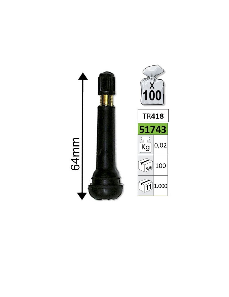 VALVULA PARA LLANTAS TR418 64 MM. En bolsa de 100 unidades