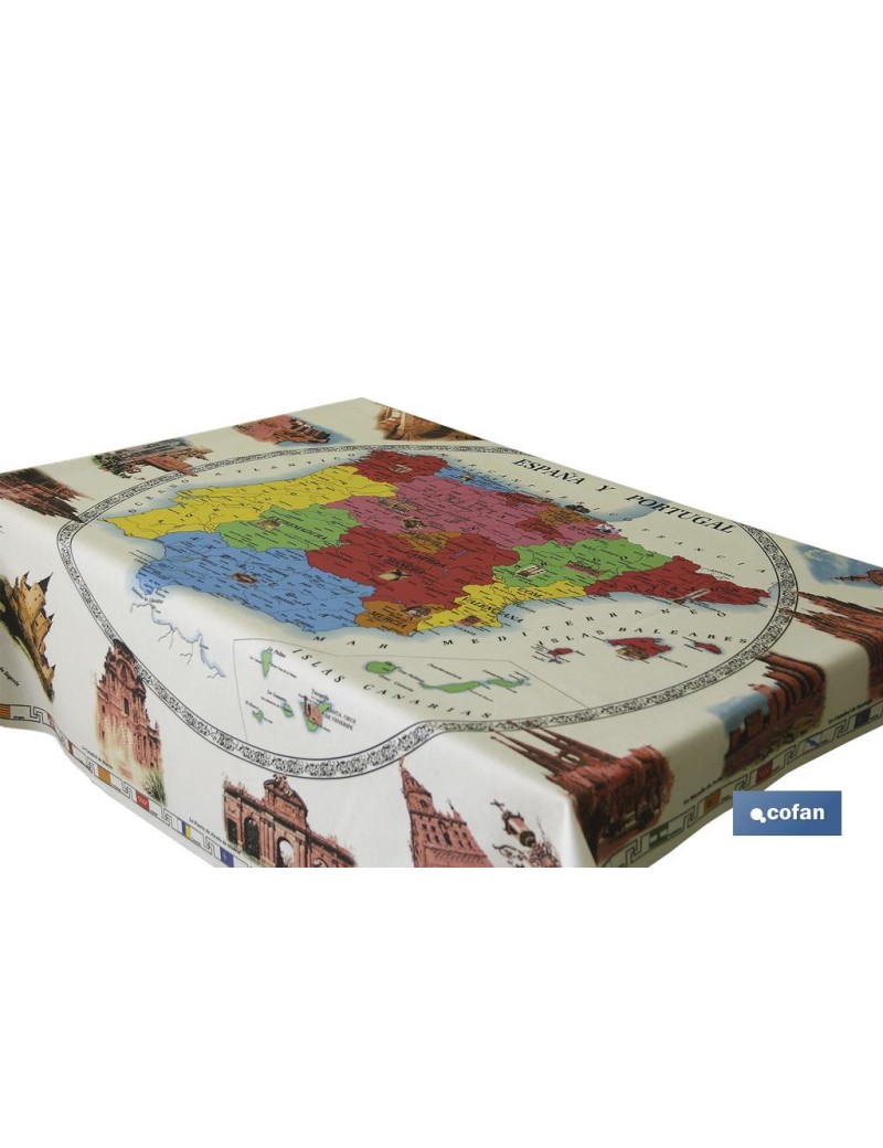 Rollo de hule antimanchas. Fabricado con 50% algodón/50% poliéster. Estampación digital, con tratamiento en polímeros de resina acrílica para evitar las manchas. Cada rollo contiene 17 mapas de España de 1,40 x 1,40 metros.