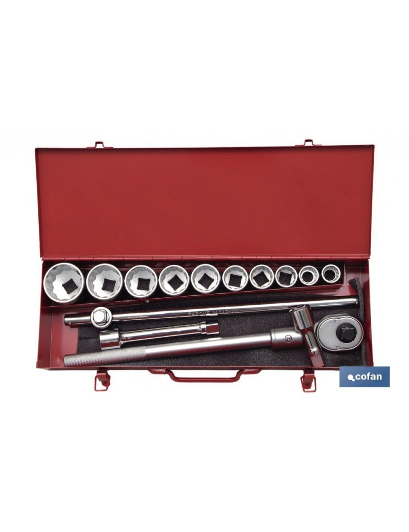 Juego de carraca 3/4\', con 14 piezas en maletín de metálico, incluyendo carraca 3/4\', extensibles y vasos de 6 caras en 3/4\'. Calidad profesional.