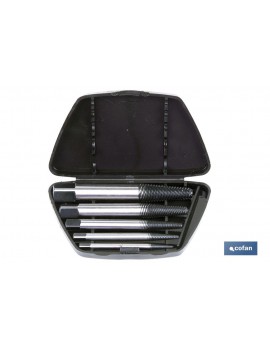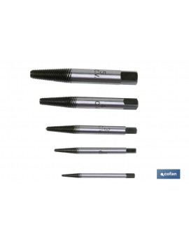 Juegos de extractores de tornillos rotos (5, 6 y 8 piezas) o machos a izquierdas. Extraen tornillos rotos desde la métrica 3 hasta la métrica 45