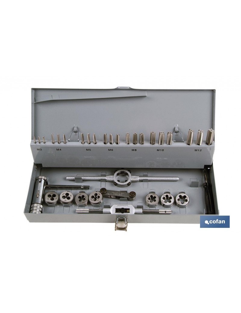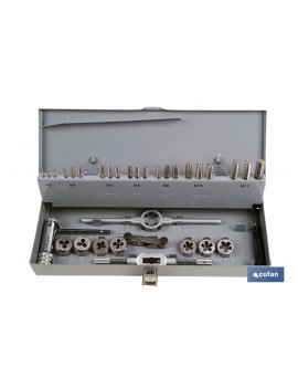 Juego machos y terrajas desde métrica 3 hasta métrica12, con volvedores y giramachos en maletín metálico.