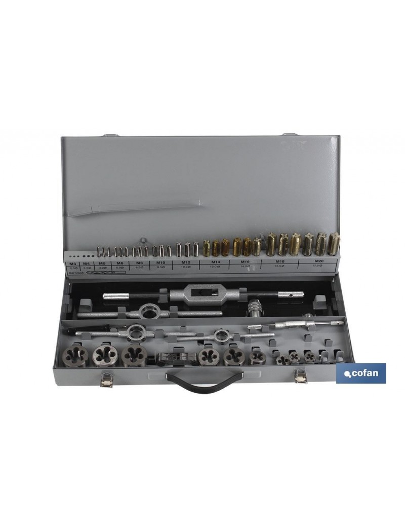 Juego machos y terrajas desde métrica 5 hasta métrica 20, con giramachos y volvedores en maletín metálico.