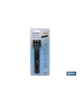 Linterna Aluminio Led 3W, 140 lúmenes, con medidas de 5 x 23cm, 3 funciones, distancia 100 metros, grado IPX3,