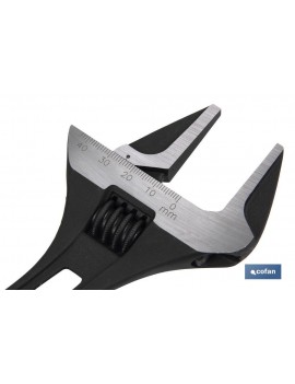 LLave ajustable gran apertura corta, 30% más ligera que una llave estándar. Cabeza extra fina que permite su uso en espacios limitados.