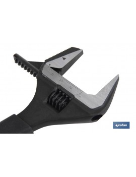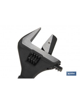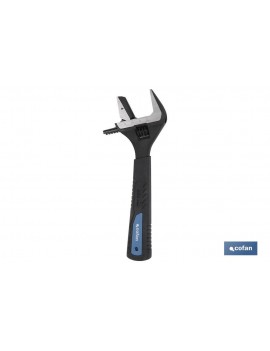 Llave ajustable reversible de gran apertura con moleta central. Mango fabricado en goma de gran confort.
