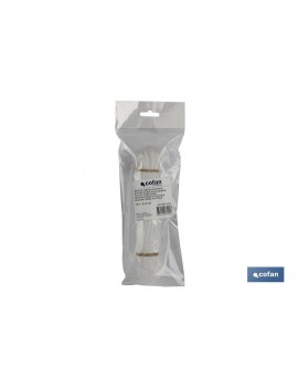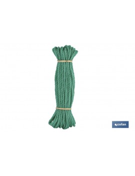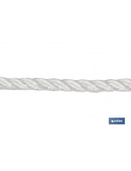 Cuerda compuesta por monofilamentos de polietileno torcidos a 4 cabos. Al ser fibras sintéticas es resistente al agua y tiene flotabilidad. Indicada para tenderos, persianas, naútica, pesca, etc.