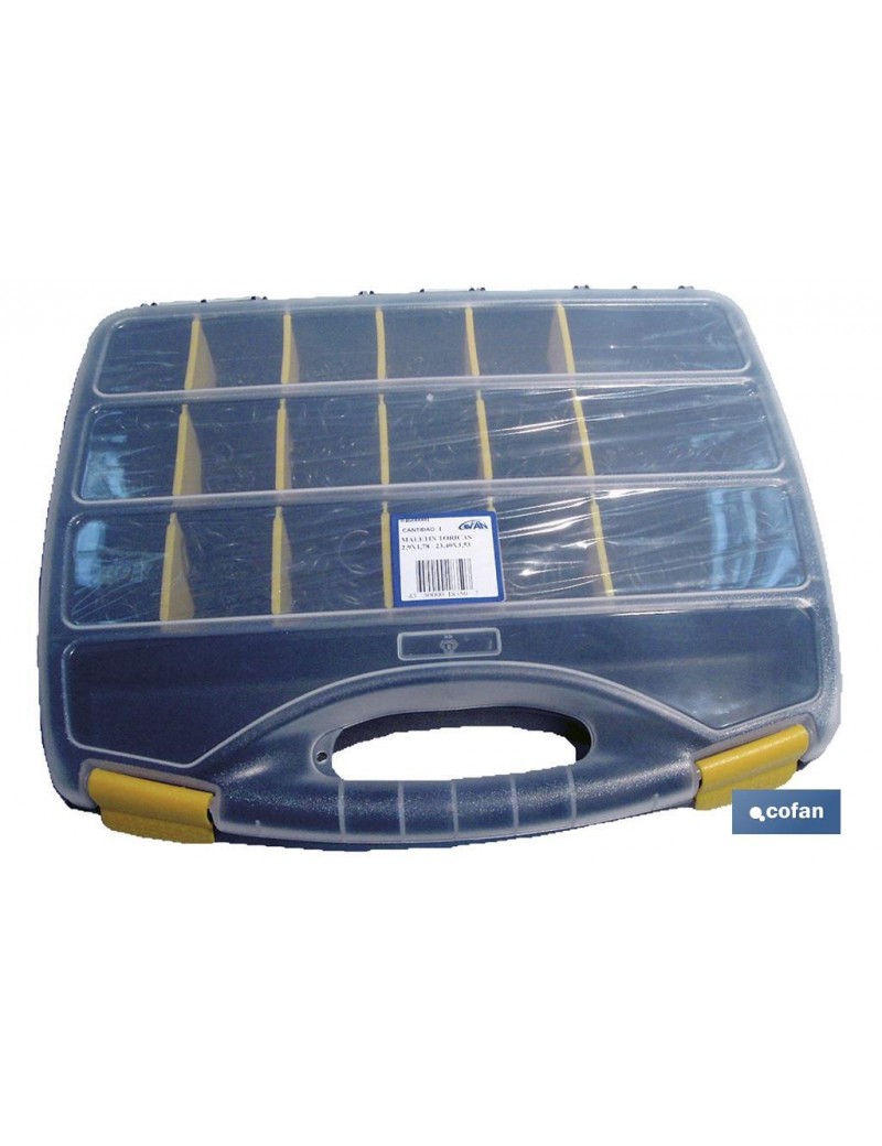 Maletas surtidas de juntas tóricas, conteniendo un surtido de 750 y 330 unidades de juntas tóricas de estanqueidad en pulgadas, de nitrilo NBR. Contiene medidas entre 2,90x1,78 y 66,04x5,33 mm. Reposicionable.