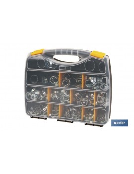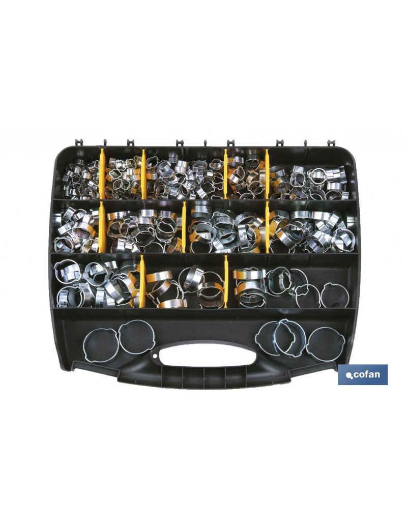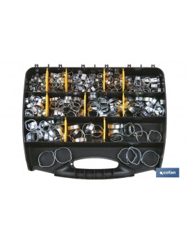 Maletín abrazaderas metálicas dos orejas. Contenido 350 abrazaderas.