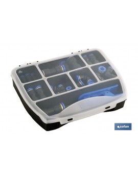 Maletín de emergencia con racores de plástco y cortador de tuberías de poliamida o tecalan. Surtido de racores mini en plástico con medidas desde 4mm hasta 12mm.