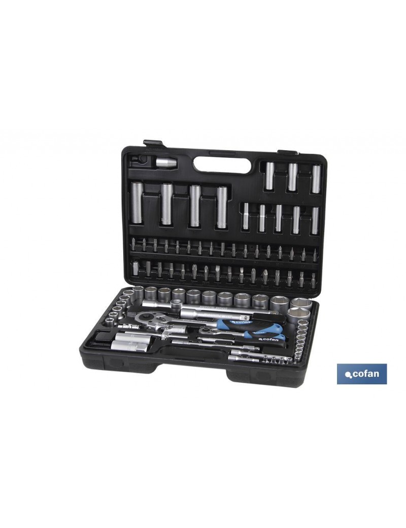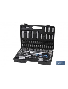 Juego de carraca multiherramienta 94 piezas en maletín de plástico incluyendo carracas, extensibles, accesorios y vasos en 1/4\' y 1/2\'.