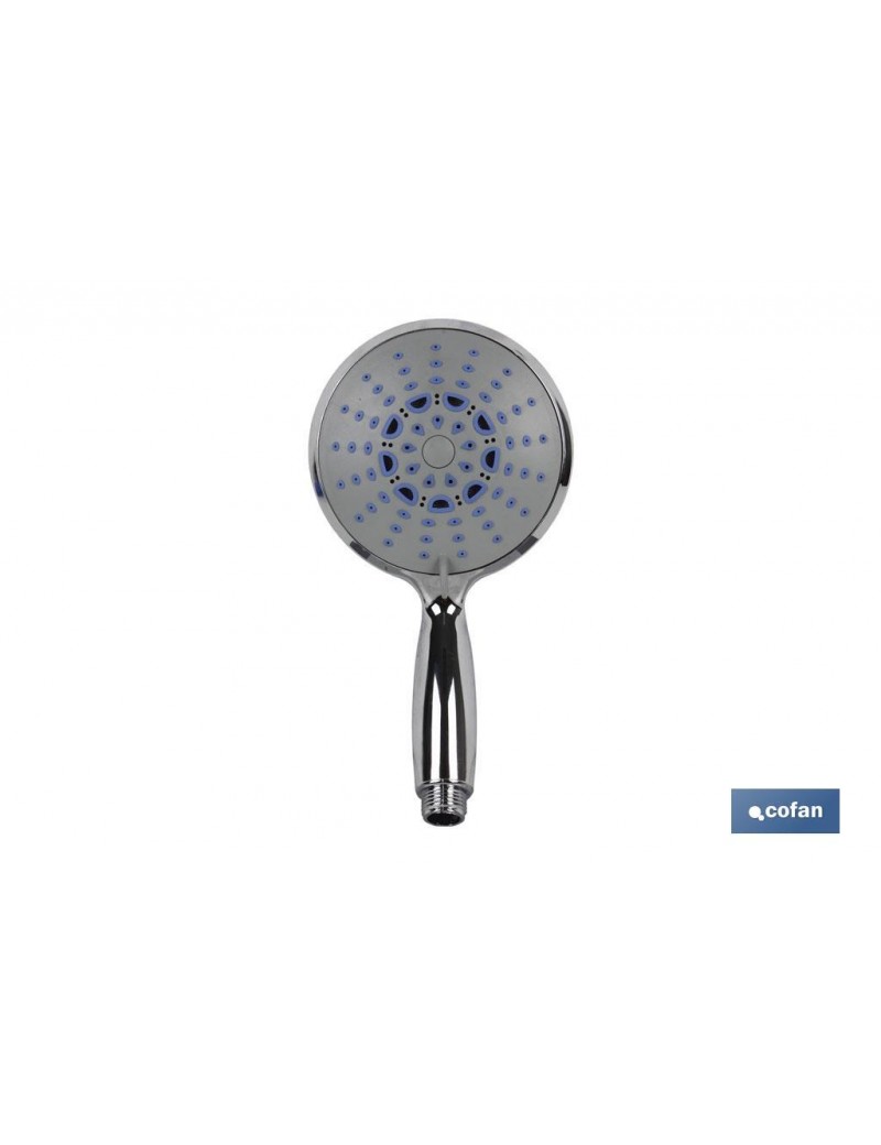 Mango de ducha cromado para baño. Cuenta con 5 funciones de pulverización. Provisto de salidas de agua antical. Las medidas del mango de 5 funciones son de 22 x 12 cm. Es muy ligero y cuenta con una sencilla y fácil instalación. El acabado cromado es resistente a los arañazos y muy fácil de limpiar. Las salidas de agua del mango de ducha, o teléfono de ducha, son de silicona suave. Basta con unos movimientos de dedos para eliminar sales que pudieran llegar a bloquear el flujo de agua. Adecuado para cualquier tipo de manguera de ducha universal.