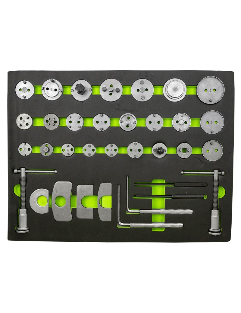 MODULO REPOSICIONADOR DE FRENOS 34PCS 24x adaptadores 4x placas de retencion 2x ejes para roscar 2x punzones 2x llaves hexagonales