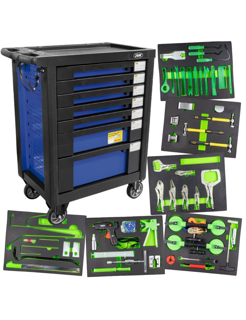 Carro de herramientas JBM con todos los utensilios de chapista necesarios para los trabajos en carrocería. Esquinas protegidas con goma muy resistente. Superficie de goma antideslizante. Cierre con llave. Cajones con marcadores de contenido. Incluye bandeja portasprays Cerradura individual. Medidas exterior: ancho 470 / largo 700 / alto 970mm Medidas interior: Cajones pequeños (x5): ancho 400 / largo 535 / alto 60mm cajon mediano (x1): ancho 400 / largo 535 / alto 130mm cajon grande (x1): ancho 400 / largo 535 / alto 200mm con módulos EVA: ref. 14059: palancas de nylon (15PCS) ref. 14060: módulos de martillos especial para chapa (7PCS) ref. 14061: módulos de mordazas (7PCS) ref. 14062: módulo de ventosas y herramientas de sustitución de lunas (10PCS) ref. 14063: módulo reparador de abolladuras (32PCS) ref. 14064: módulo de útiles para abrir coches (11PCS)
