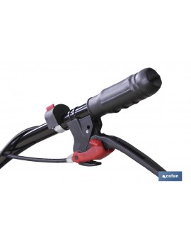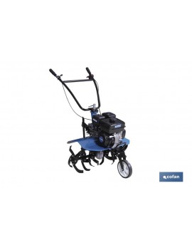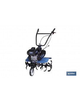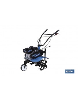 Motoazada con motor de 4 tiempos de gran calidad, ideal para medianas y grandes huertas. Caja de cambios y embrague de correa extra. 2 velocidades hacia adelante y una velocidad hacia atrás.