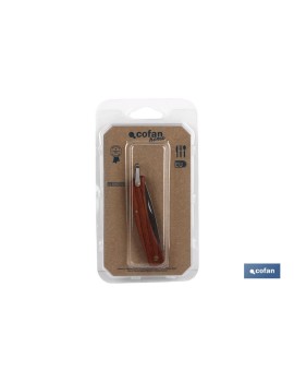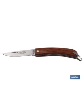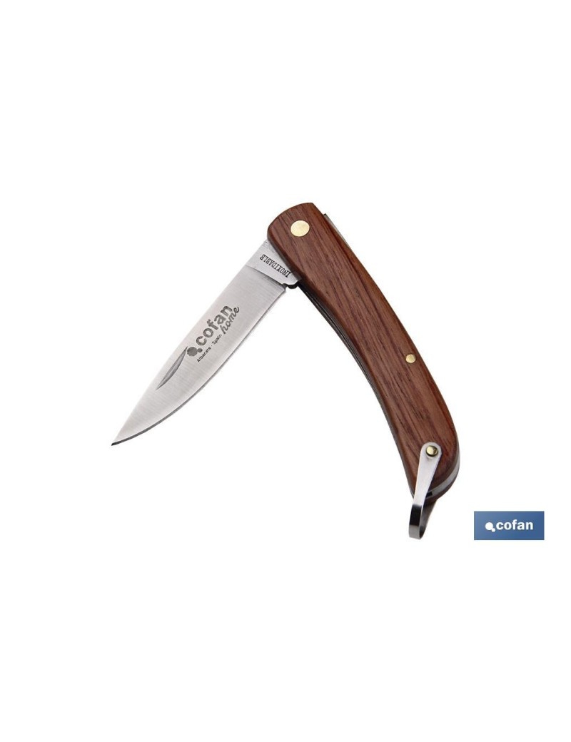 Navaja de Campaña de óptima calidad. Cuenta con una hoja de acero inoxidable de 8,5 cm de longitud y mango fabricado en madera. De alta resistencia y durabilidad. Envasada en blíster unitario. Fabricada en Albacete (Castilla-La Mancha).