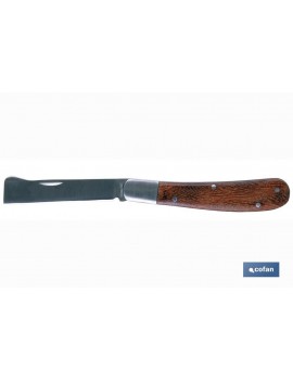 Navaja plegable de injertar de óptima calidad. Cuenta con una hoja inoxidable con 7 cm de longitud y mango fabricado en madera. Navaja Plegable de alta resistencia y durabilidad. Envasado en blíster unitario.