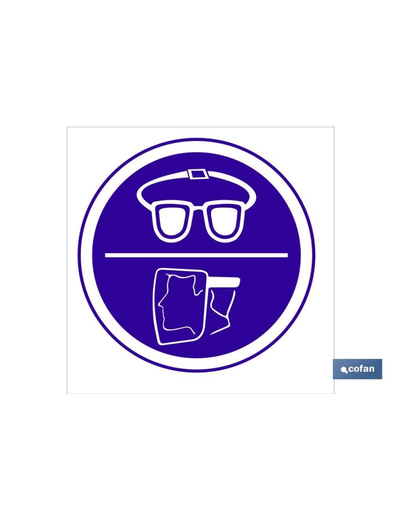 Señal de obligación, obligatorio uso de gafas y pantalla.