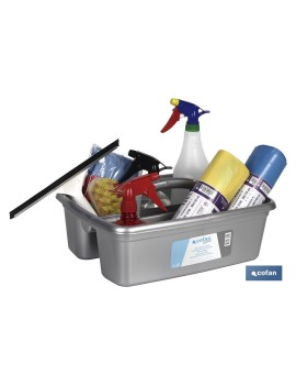 Organizador para los productos de limpieza de color gris. Modelo Albahaca. Es la solución perfecta para tenerlo todo a mano y colocado en tu hogar, esto puede ser posible gracias a este producto. Con un diseño compacto y con un asa para poder transportarlo a cualquier sitio, es cómodo y versátil. Muy resistente y duradero. Pack de 6 Unidades. Medida 39.5 x 29 x 16 cm.