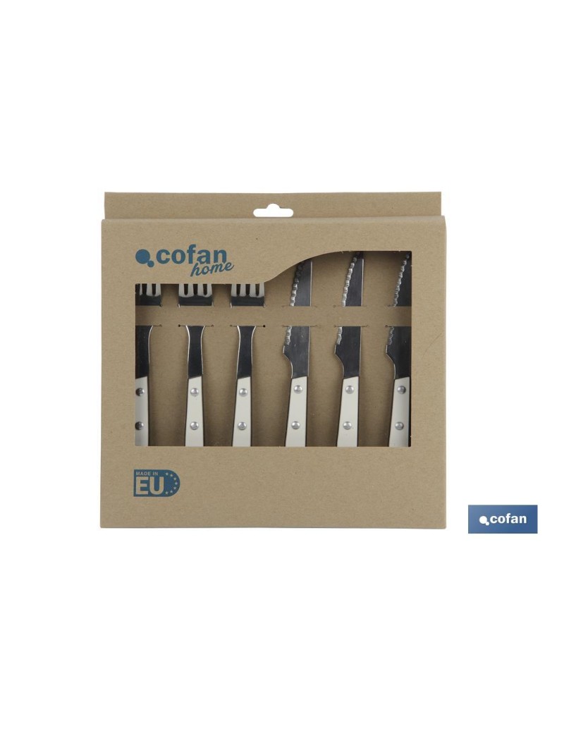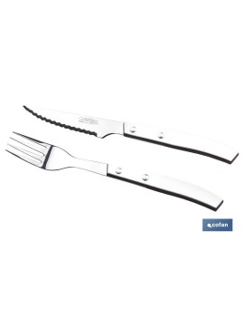 Pack de 3 cuchillos chuleteros y 3 tenedores de óptima calidad. Fabricados en acero inoxidable y mangos fabricados en fibra de celulosa y melamina en color blanco. De alta resistencia y duraderos. Envasados en blíster con una presentación elegante y llamativa. Fabricados en Albacete.