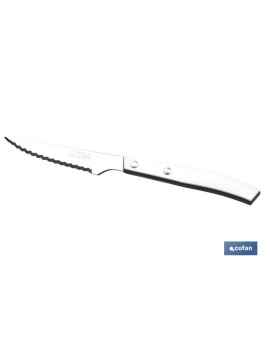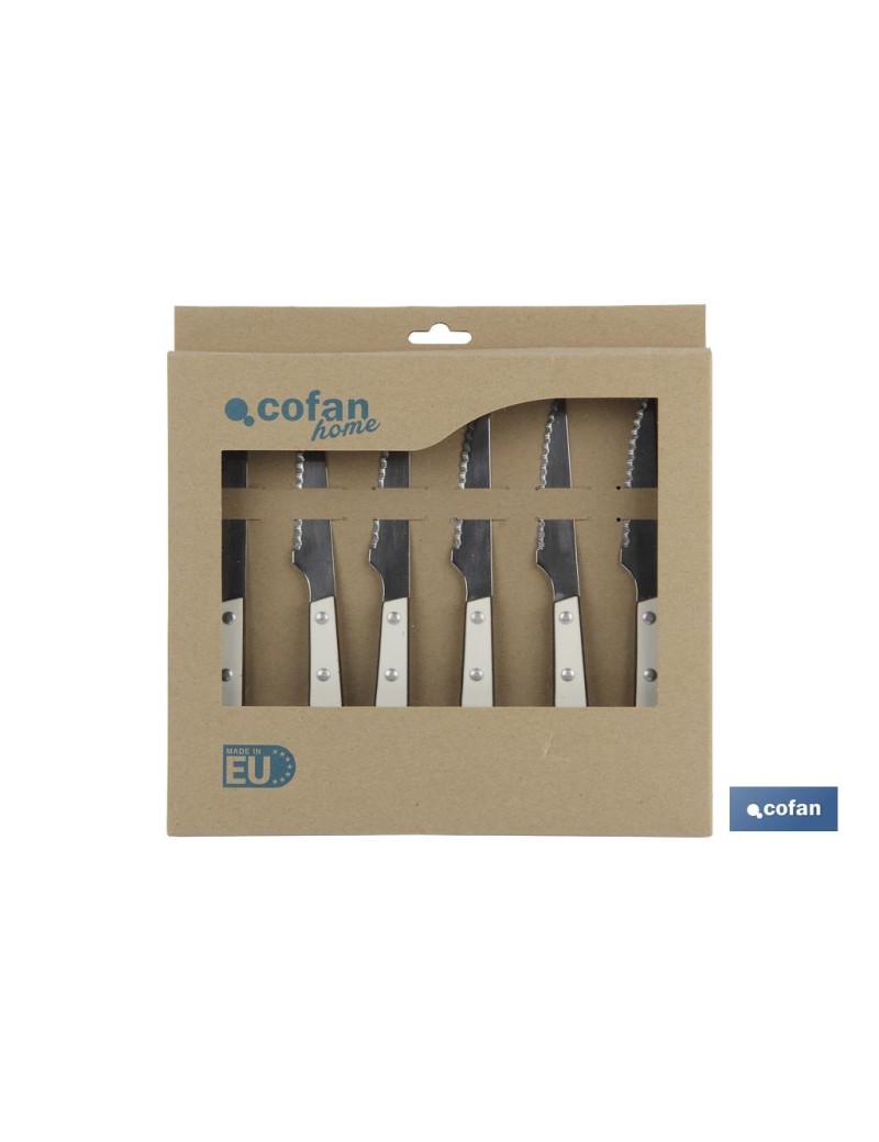 Pack de 6 cuchillos chuleteros de óptima calidad. Sus hojas microdentadas están fabricadas en acero inoxidable y mangos fabricados en fibra de celulosa y melamina color blanco. De alta resistencia y duraderos. Envasados en blíster con una presentación elegante y llamativa. Fabricados en Albacete.