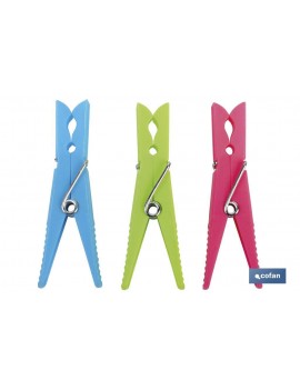 Pinzas para la ropa de plástico estándar. Se venden en pack de 24 unidades. Con medida de 7 cm de longitud. Las pinzas son resistentes a la intemperie y tienen una larga durabilidad. El paquete se compone de pinzas con diferentes colores. Tiene un diseño extrafuerte para sostener las prendas húmedas. Cada pinza de plástico está equipada con un resorte extra fuerte hecho de alambre de acero galvanizado.