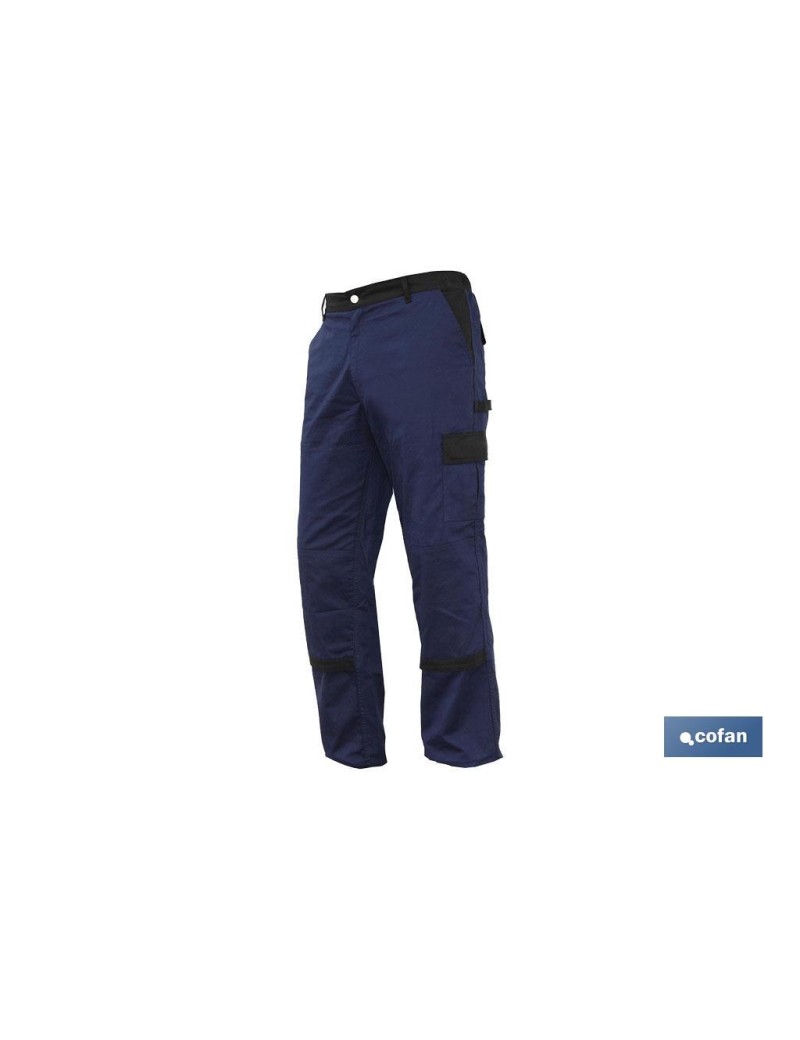 Pantalón de trabajo elástico modelo Jano regular fit. Compuesto por un 97,76 % de algodón y un 2,24 % de elastano, gramaje de 240 g/m2. Color disponible azul marino con los detalles en negro. Tallas desde la 38 hasta la 64. Dispone de varios bolsillos muy prácticos para guardar todo tipo de herramientas u objetos. Estos pantalones son aptos para cualquier sector de la industria, construcción o agricultura.