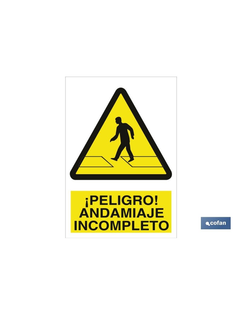 Señal de advertencia de peligro andamiaje incompleto. Tamaño y material a elegir.