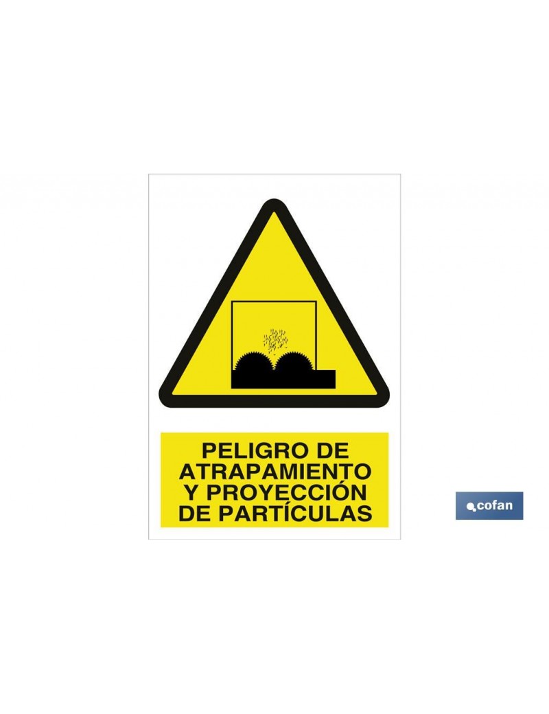 Señal de advertencia, peligro de atrapamientos y proyección de partículas.