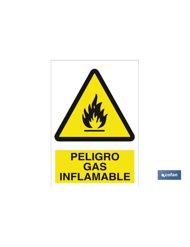 Señales de PELIGRO GAS INFLAMABLE en poliestireno (plástico) de 1,5mm y Adhesivas disponibles las dos gamas en varios tamaños.