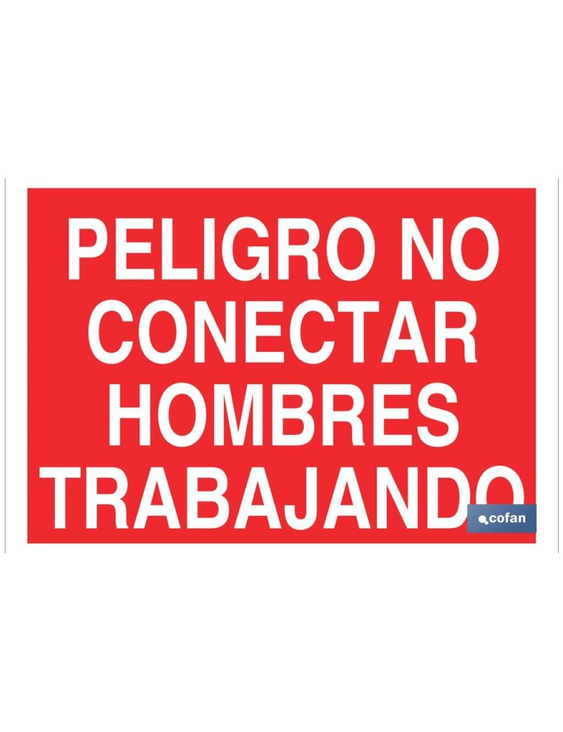 Señal de prohibición con texto, Peligro no conectar hombres trabajando.