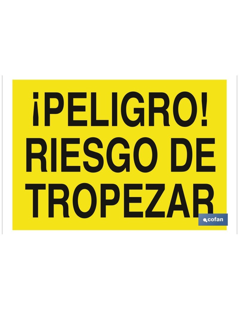 Señal de advertencia de peligro con texto riesgo de tropezar. Tamaño y material a elegir.
