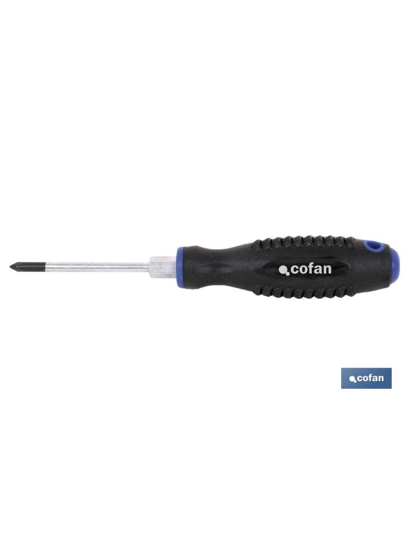 Destornillador phillips DIN ISO 8764-1 con hexágono en la varilla, modelo confort plus, con medidas desde PH-1 hasta PH-3 y longitud máxima de 27 centímetros.