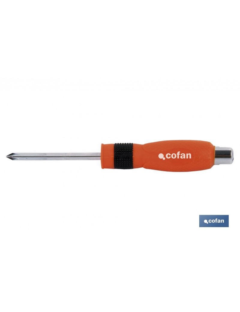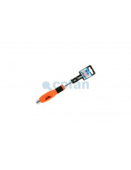 Destornillador phillips de impacto con huella de PH-1, PH-2 y PH-3, hechos en acero cromado, contienen saliente para el golpeo y partes planas para añadir herramientas en caso de giros forzados.
