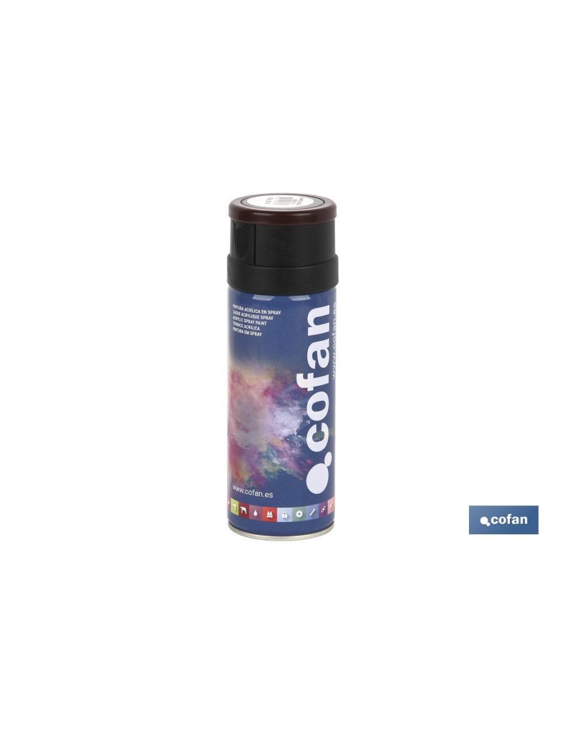 Pintura de Esmalte acrílico 100 % en espray. Disponible en diferentes colores y enumerados por su Ral. Ideal para superficies metálicas como hierro, bronce, aluminio, materiales plásticos, albañilería, madera y cemento. Para uso en interiores y exteriores, de secado rápido. Contenido de 400 ml.