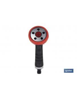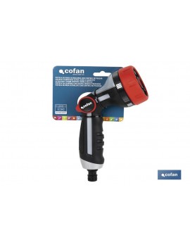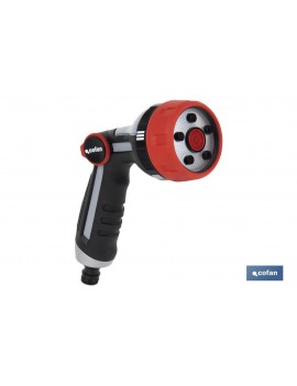 Pistola de riego con control de caudal y varias funciones de riego. Indicada para jardines, patios y terrazas. También puedes usarla para lavar el coche o a tu mascota. Puedes regular el caudal del agua de forma sencilla y segura cómodamente con el pulgar. Es ultraligera y su mango ergonómico tiene un agarre cómodo y seguro. Con 5 modos: chorro concentrado, chorro a presión, chorro plano horizontal, neblina depulverización y ducha.