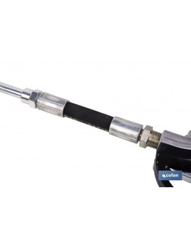 Pistola de engrase de 90° de gran precisión para el control del flujo de lubricante. Dispone de una manguera flexible y una boquilla antigoteo 90° para evitar cualquier pérdida. Esta pistola cuenta con un mecanismo de engranaje ovalado para una óptima precisión. Está fabricada en aluminio fundido a presión. Cuenta con una tasa de flujo de hasta 30 litros por minuto y una presión máxima de trabajo de hasta 1.000 psi (70 bares). Existe la opción de incorporar un contador digital de gran precisión con indicador de la cantidad suministrada.