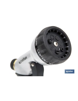 Pistola de riego para jardín de metal con 7 posiciones diferentes de pulverización. Esta pistola de riego se puede usar para regar plantas o céspedes, limpiar mascotas, coches, ventanas, terrazas u otro tipo de superficie/objetos. La pistola tiene un diseño de gatillo frontal muy cómodo, adecuado a la estructura de la mano y además su mango es ergonómico. La pistola de riego es de muy buena calidad, está fabricada de metal. Fácil de operar y controlado con la potencia de los dedos para un control más fácil y mejor del flujo de agua. Previene el óxido, la corrosión y la abrasión. Nuestra boquilla de manguera de metal no solo es muy duradera, es mucho mejor que las boquillas de manguera de plástico comunes.