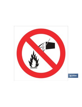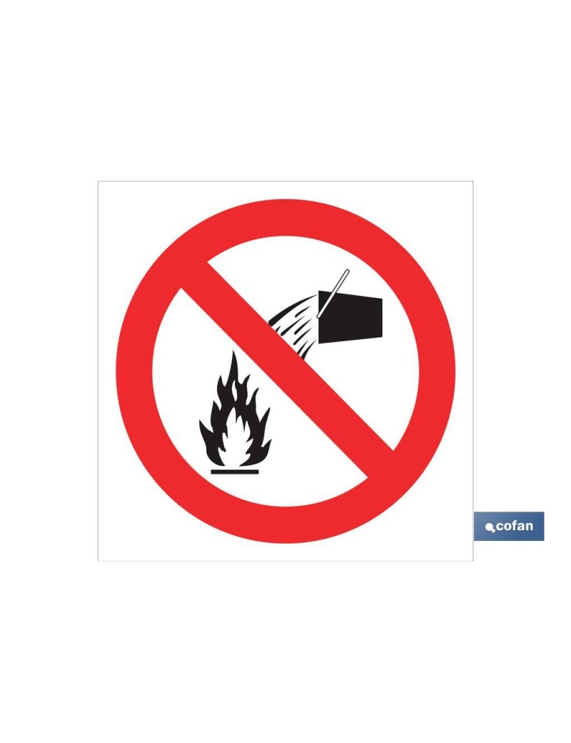 Señal de prohibición, solo pictograma, prohibido apagar fuego con agua.