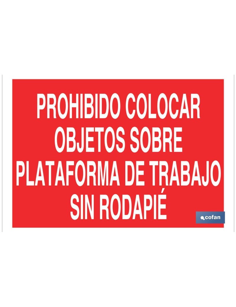 Señal de prohibición, con texto, prohibido colocar objetos sobre plataforma de trabajo sin rodapié.