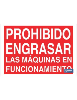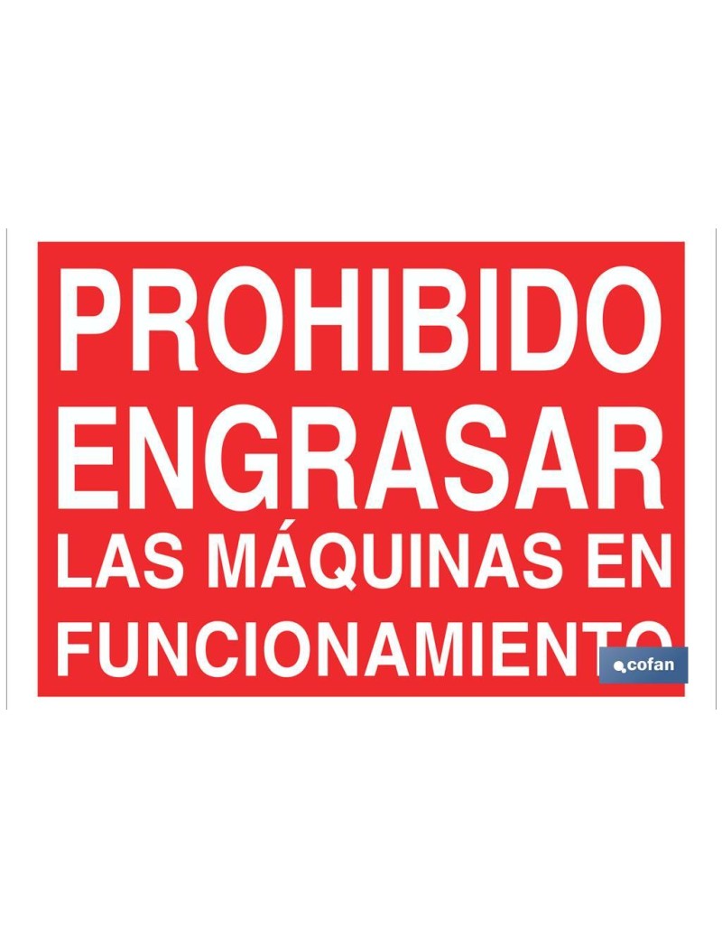 Señal Texto prohibido engrasar máquinas en funcionamiento en varias medidas y materiales.