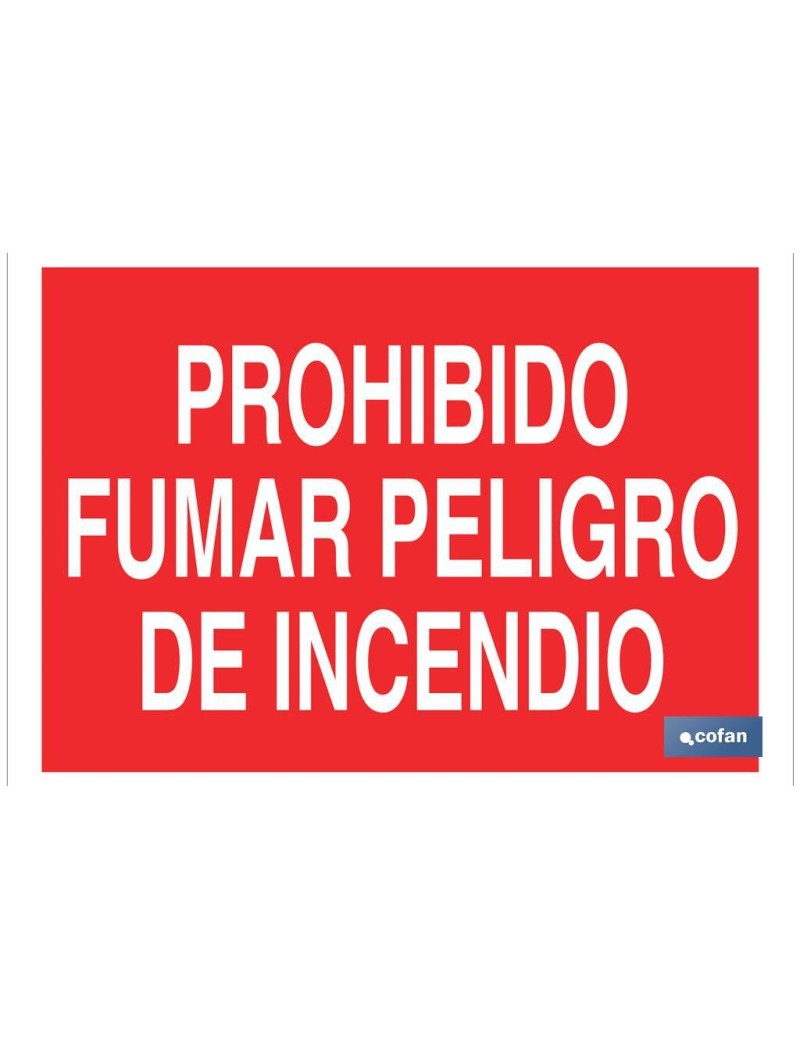 Señal Texto prohibido fumar peligro de incendio en varias medidas y materiales.