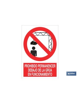 Señal Pictograma y Texto prohibido permanecer debajo de la grúa en varias medidas y materiales.