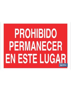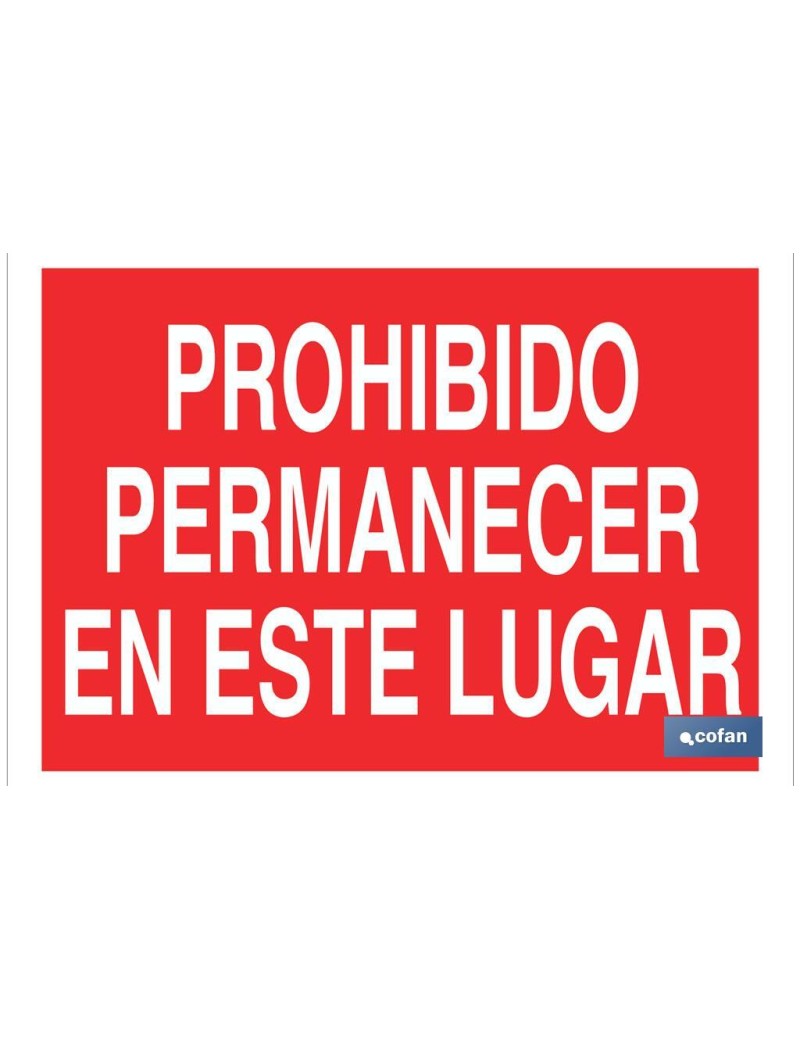 Señal Pictograma y Texto prohibido permanecer en este lugar en varias medidas y materiales.