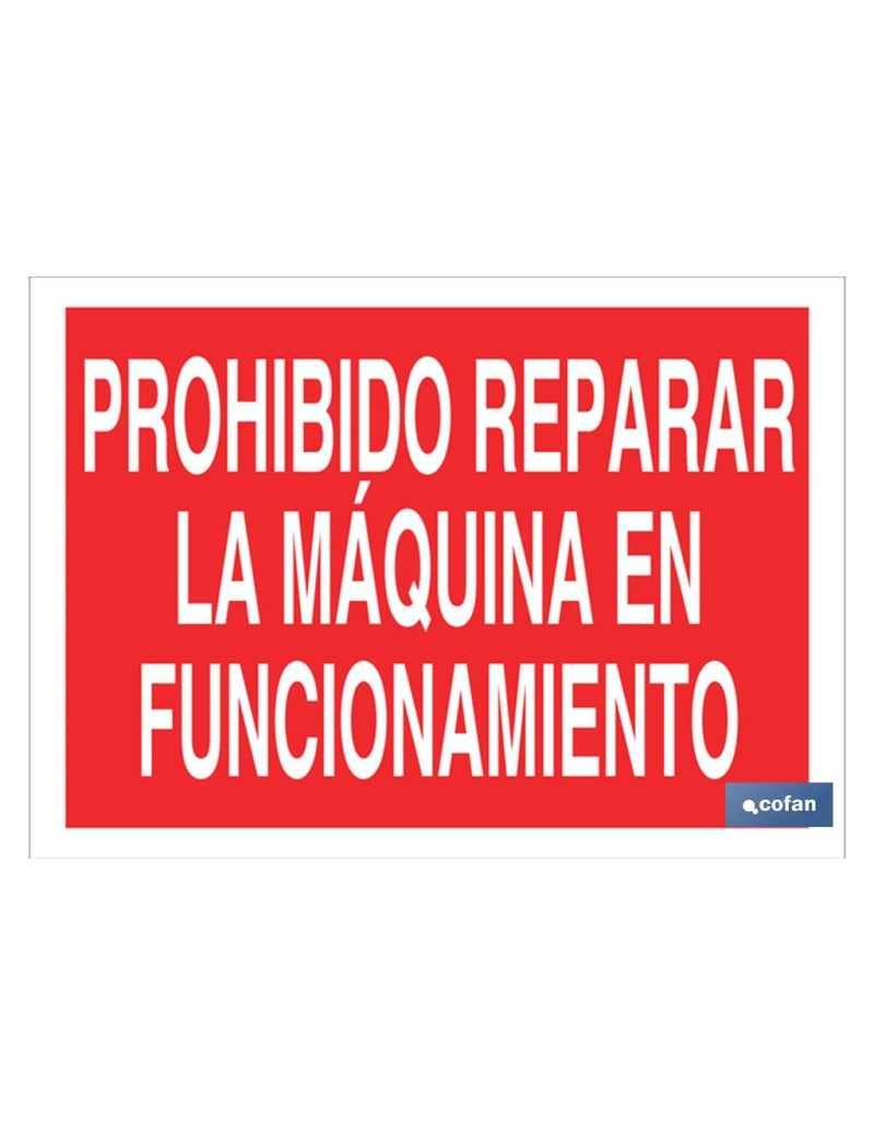 Señal Texto prohibido reparar la máquina en funcionamiento en varias medidas y materiales.