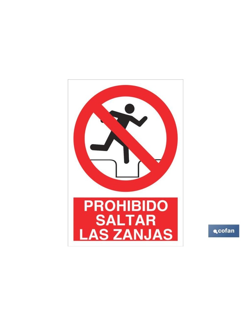 Señal Pictograma y Texto prohibido saltar zanjas en varias medidas y materiales.