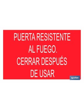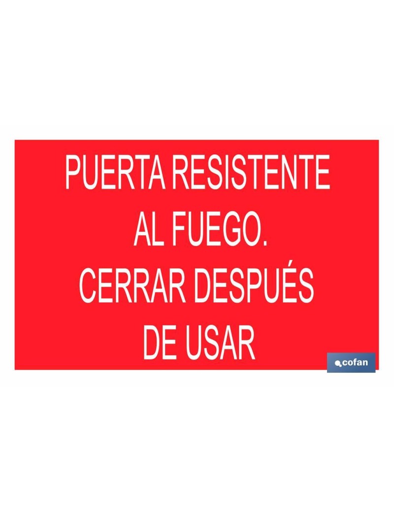 Señal de prohibición con texto Puerta resistente al fuego. Cerrar después de usar.