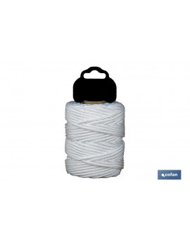 Riel trenzado de 3mm, trenzado en polipropileno de gran tenacidad color blanco. Hilo en blíster de 50 metros de longitud. Resistente al rozamiento y a la tensión.Adecuado para rieles de cortinas, bricolaje, construcción, jaulas, jardinería, etc