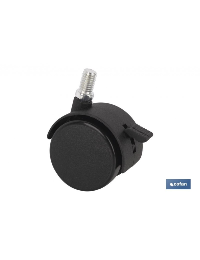 Ruedas Plástico Tornillo/Freno con rosca, con soporte para encajar dos ruedas gemelas. Ideal para muebles pequeños, expositores, sillas de oficina, estanterias y armarios.