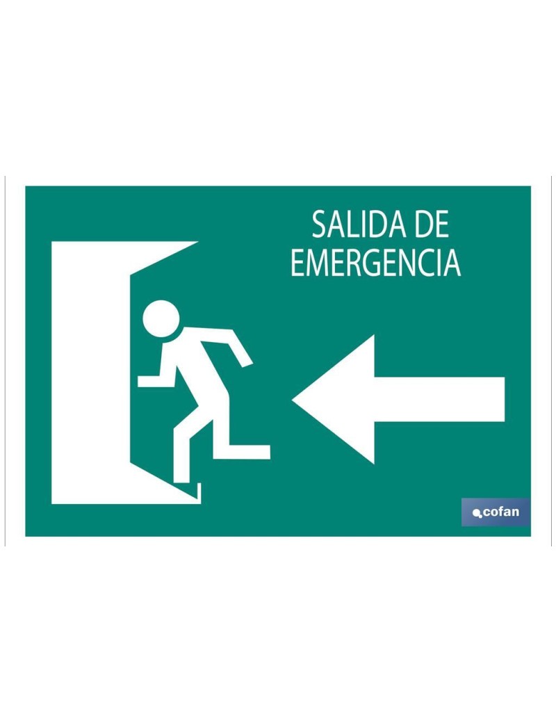 Señal texto salida de emergencia luminiscente izquierda en varias medidas.