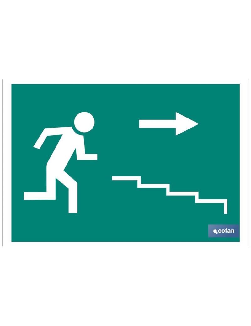 Señal de evacuación de Salida bajada escalera con flecha a la derecha. Señal de Pictograma. Tamaño y material a elegir (luminiscente y adhesivo)
